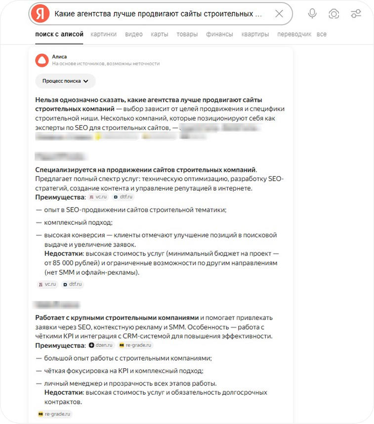 ИИ формирует ответ, собирая и анализируя данные с различных источников: отраслевых рейтингов, отзывов клиентов, кейсов агентств, а также открытых публикаций и исследований. На основе этого анализа он формирует структурированный и обоснованный ответ, иногда частично цитируя авторитетные бренды или их сайты для примеров, чтобы проиллюстрировать выводы.
